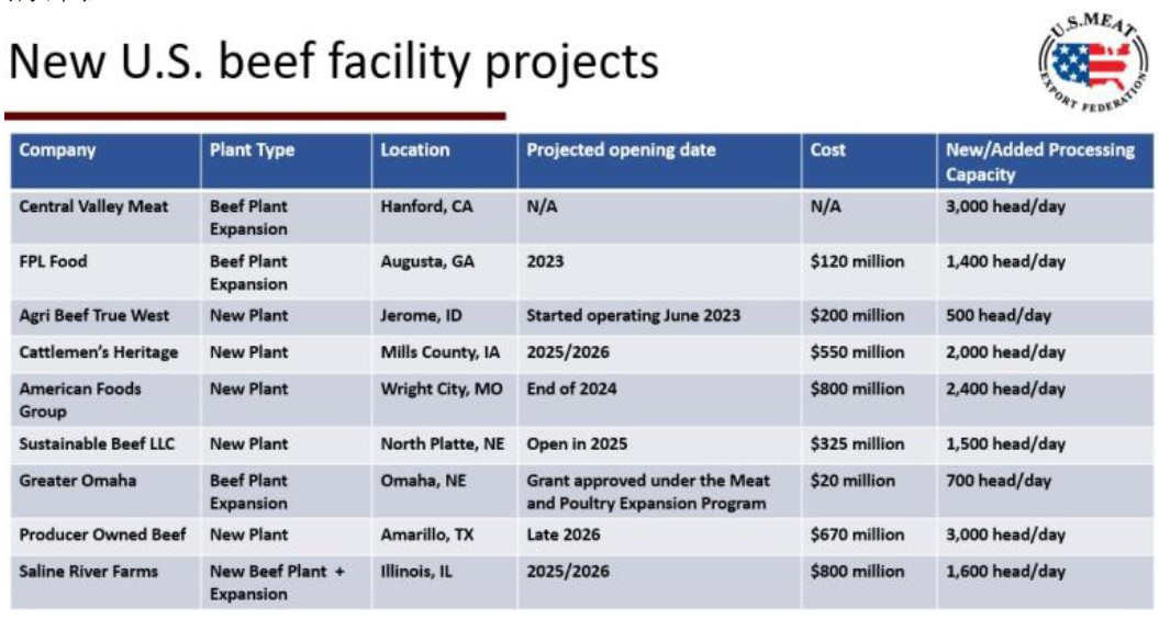 Producer Owned Beef 是一家由德克薩斯州牧場主組成的公司,宣布將於本月底在德克薩斯州阿馬裡洛破土動工一座耗資 6.7 億美元的大型牛肉屠宰和加工廠。 該項目在一年前首次宣布,但最近的新聞稿稱該項目現已準備好推進施工階段。 該項目已獲得阿馬裡洛經濟發展公司的財政支持,贈予該公司610 英畝土地用於開發該設施,並為該項目提供另外 1,100 萬美元的獎勵。 另一個州商業發展實體,德克薩斯企業基金正在為計劃中的設施提供總計1,220 萬美元的贈款。 該工廠的設計產量將達到每天屠宰 3,000 頭牛,並僱用約 1,600 名工人,這將使其躋身美國最大牛肉工廠前 20 名之列。 Producer Owned Beef擁有獨特的合作所有權結構,該公司的多數股權所有者是向工廠供應牛的牧場主和飼養者。 該公司的生產所有者將根據牛肉的批發銷售價格獲得一定比例的收入,並共同分享工廠的利潤,而不是根據公正的合同將牛出售給工廠。自該企業最初於 2022 年 8 月發布公告以來,該工廠的奠基工作已推遲了幾個月,新的預計開業日期為 2026 年末。Producer Owned Beef是過去幾年宣布的六個新牛肉項目之一(參見下表),包括我們在上週的公報中強調的Saline River Farms 項目。新項目中,Agri Beef 位於愛達荷州的True West牛肉工廠已竣工並開始運營。 上週,美國農業部宣布撥款 1.23 億美元,支持擴大美國肉類和家禽加工產能。 個人資助金額從 25 萬美元到 1,000 萬美元不等。 美國農業部已通過其農村發展部門撥款超過 2 億美元,以支持美國肉類加工能力的擴張。 2021年,現任美國政府宣布,作為其1.9萬億美元的美國救援計劃刺激項目的一部分,將撥款最多10億美元,通過啟動獨立肉類加工項目來“增加競爭”,以“增強食品供應鏈的彈性”