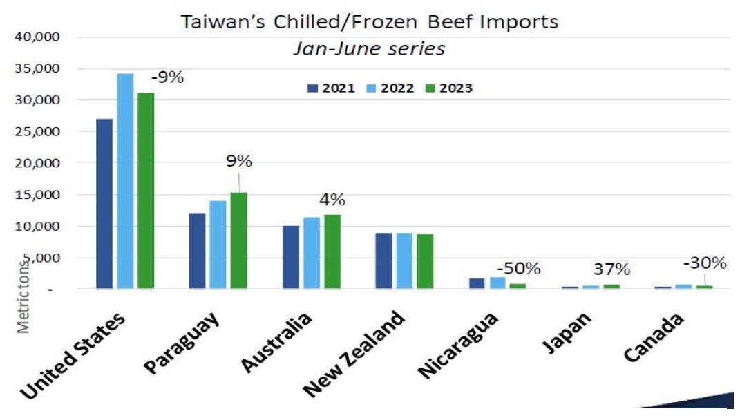 由於全球價格持續走高,中國台灣地區宣布將延長牛肉和其他幾種戰略商品的關稅削減。 關稅減免由10新台幣/公斤(0.31 美元/公斤)減至 5 新台幣/公斤(0.16美元/公斤),16類牛肉產品的關稅減免將維持到年底。2021 年 12 月首次實施的關稅減免也將延長用於小麥、奶粉、黃油和汽油等關鍵商品。中國台灣地區1-7月進口量為8.6萬噸,僅略高於去年水平。儘管台幣疲軟,但市場以美元計價的進口費用大幅下降,所有來源的牛肉進口平均每噸價值為 8,466 美元/噸,比 2022 年上半年平均進口價值下降 19%。所有主要供應商的每噸價格均有所下降,包括美國(-23%)、澳大利亞(-17%)、巴拉圭(-12%)和新西蘭(-4%)。