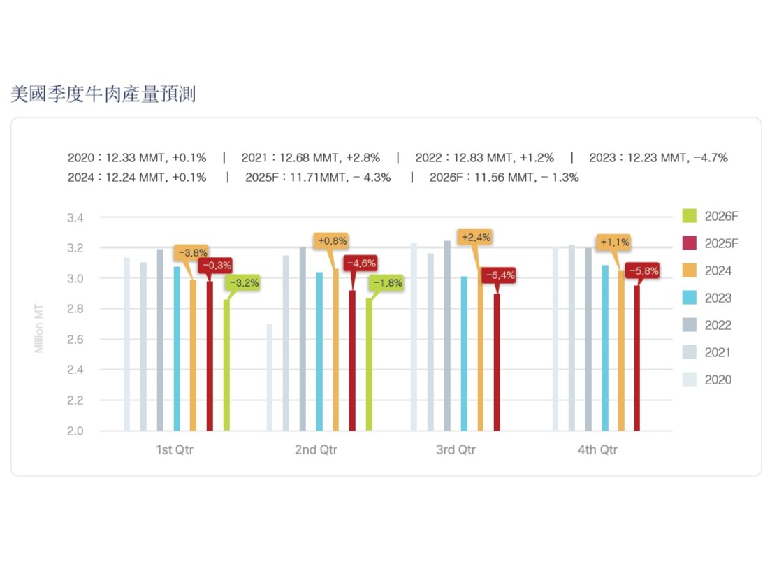 美國農業部上周發佈最新《世界農產品供需預測報告》(WASDE)。該報告將2025年美國牛肉產量預期較上月下調0.4%,因第三、四季度屠宰量預計低於早前預測。總產量預計為1,171萬噸,較2024年下降4.3%。