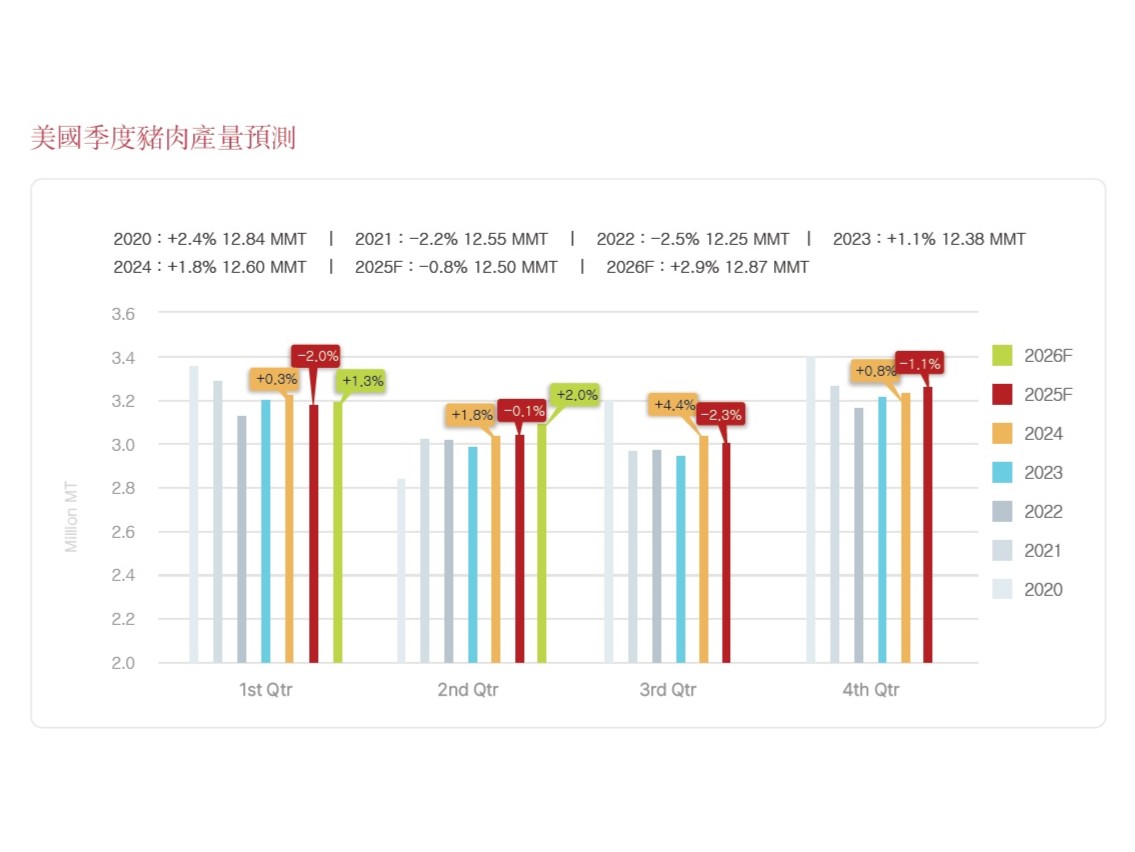 2025年美國豬肉產量原本預計全年將同比上升,但6月以來屠宰量及產量下行趨勢促使預期下調。8月報告預計同比微降0.2%後,9月報告再下調0.2%,目前預計總產量為1,250萬噸,較2024年下降0.8%。